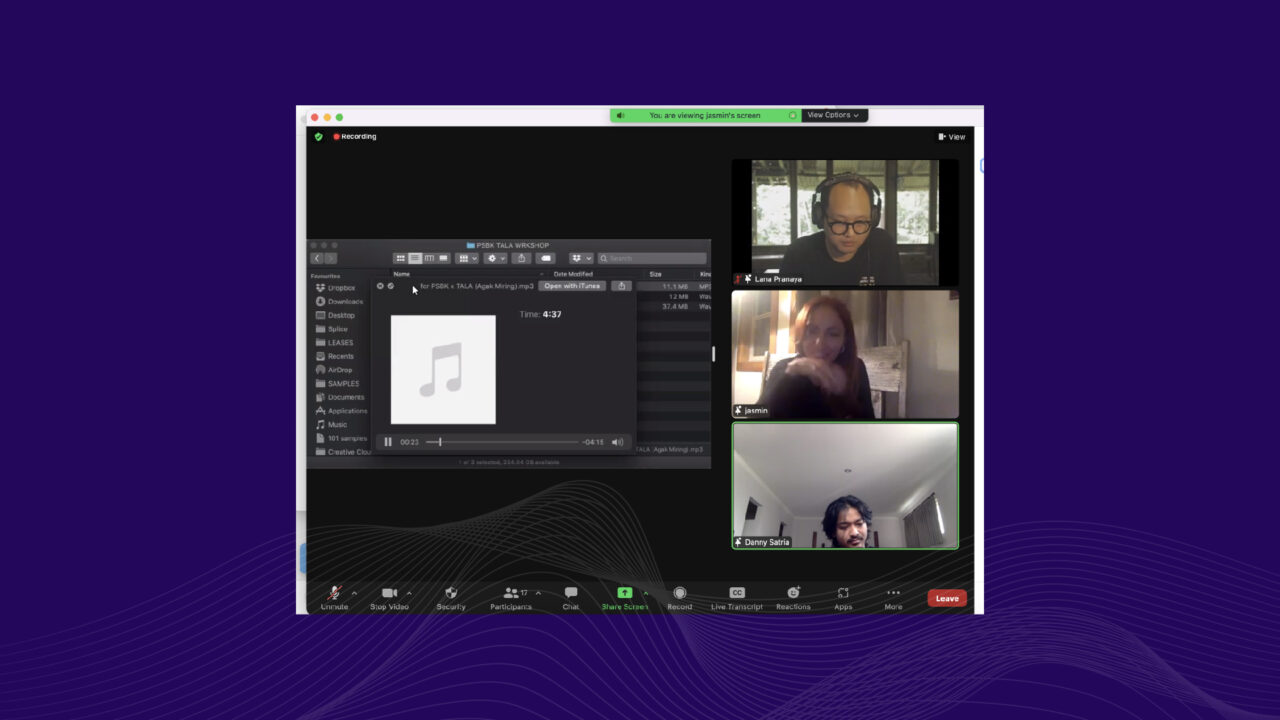 Di sela-sela residensinya, TĀLĀ berkesempatan untuk bertemu dan berkolaborasi dengan para musisi dan produser Indonesia dalam 2 sesi workshop musik digital yang dilakukan secara virtual. Para kreator tersebut diantaranya Asara, Danny Satria, Eri Rukmana, Gendra Wisnu Buana, Hengga Tiyasa, Jenar Kidjing, Wafiq Giptama, Herbudi Tri Prasetya dan Vandy Rizaldi. Dipandu oleh Lana Pranaya, mereka saling berbagi pengalaman dan memperdengarkan musik hasil kolaborasi atas sample yang diberikan oleh TĀLĀ.