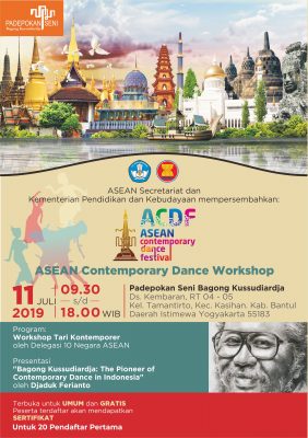 WORKSHOP ASEAN CONTEMPORARY DANCE FESTIVAL Kamis, 11 Juli 2019 Pukul 9.30 – 18.00 WIB Di Padepokan Seni Bagong Kussudiardja Ds. Kembaran RT 04-05 Tamantirto, Kasihan,